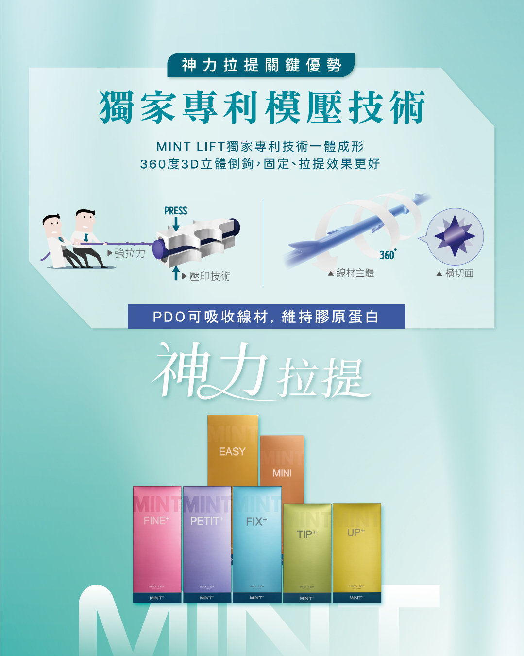 MINT秘特拉提線採一體成型,不易斷裂,特殊的 360 度螺旋定位、3D立體倒鉤提供強大的固定力與引張力,讓拉提效果更穩固持久。
